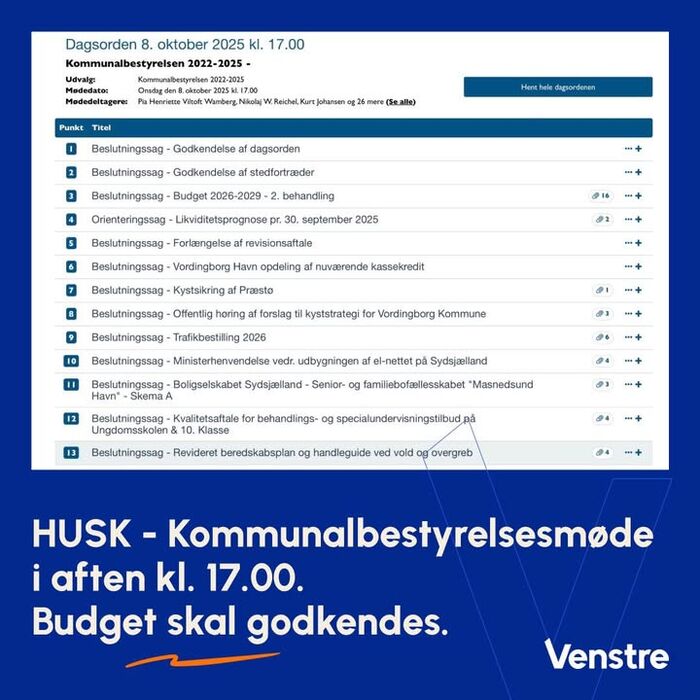 I aften kl 17 har vi kommunalbestyrelsesmøde. Der er budgetvedtagelse for 2026. Vi er 28 medlemmer, der er enige om budgettet 👏 Budget er altid det store punkt på oktobers dagsorden. Alle partier har forberedt…